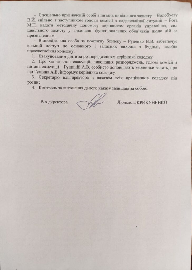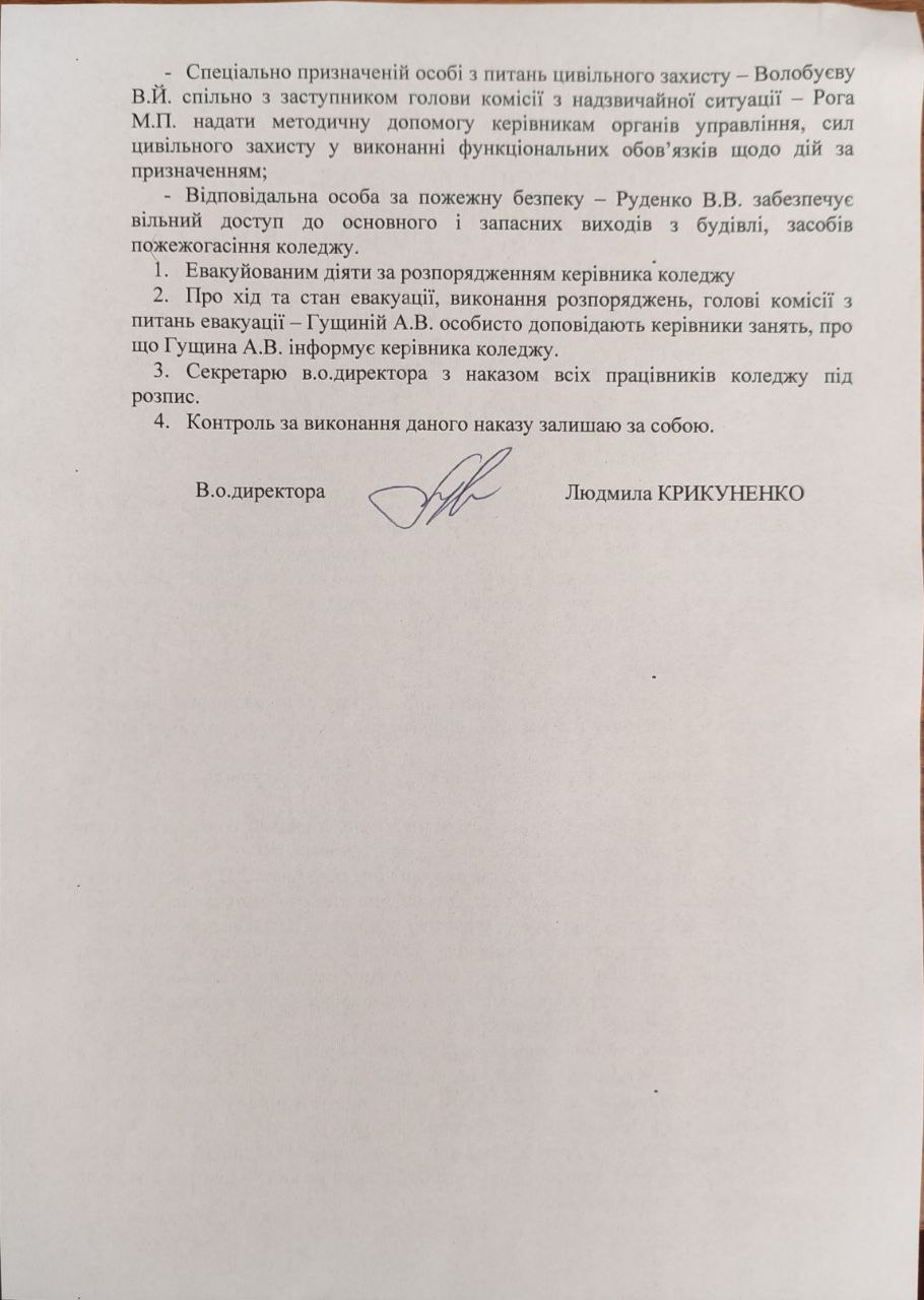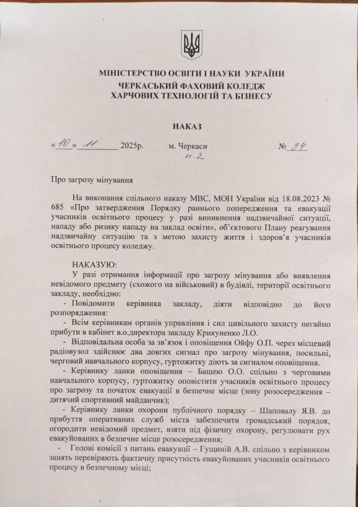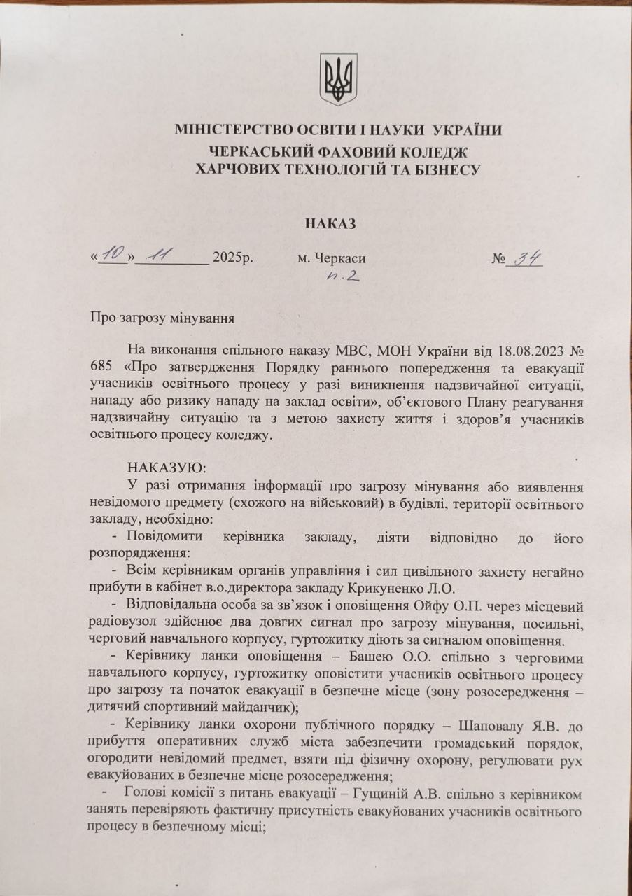Головна » Новини » Наказ №34 від 10.11.2025р. Про загрозу мінування