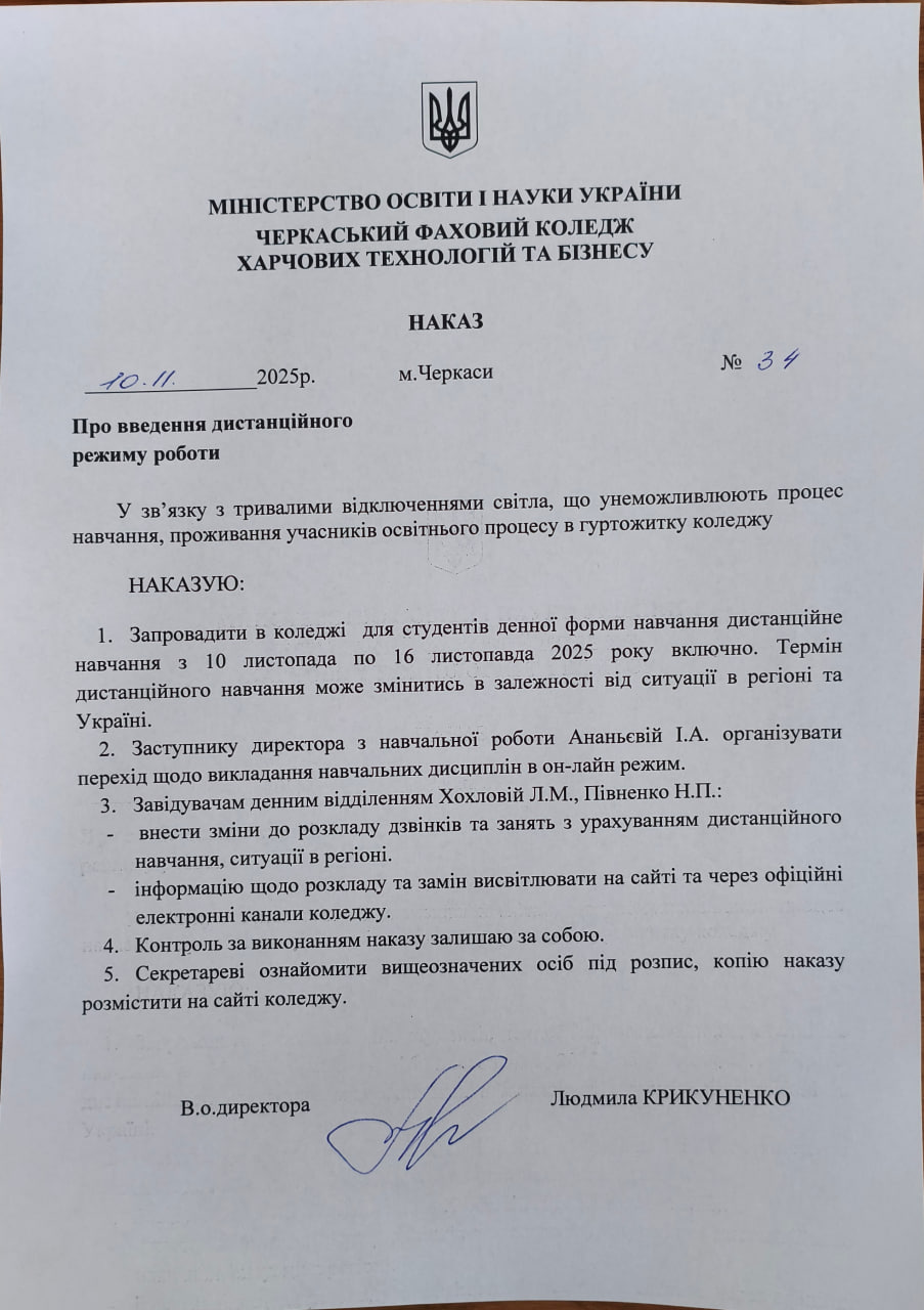 НАКАЗ від 10.11.2025р. Про дистанційне навчання