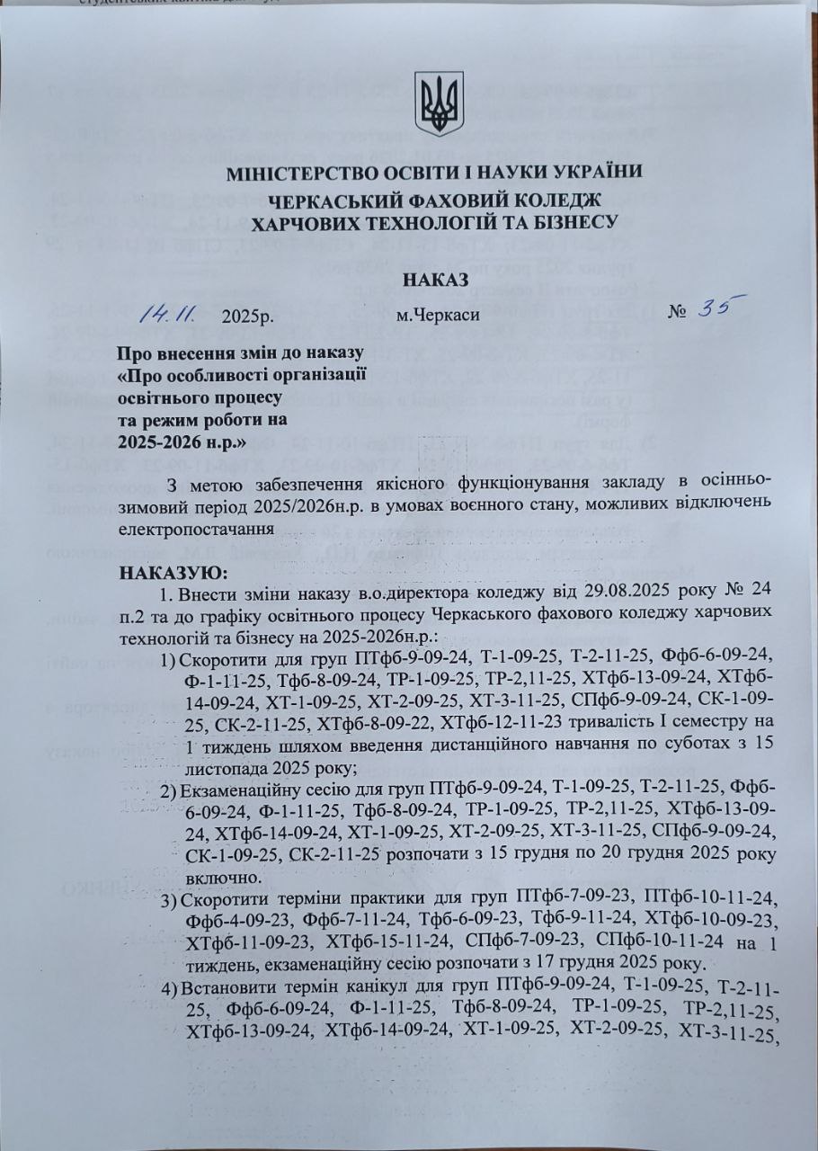 Наказ №35 від 14.11.2025р. Про внесення змін до наказу “Про особливості організації освітнього процесу та режим роботи на 2025-2026 н.р.”