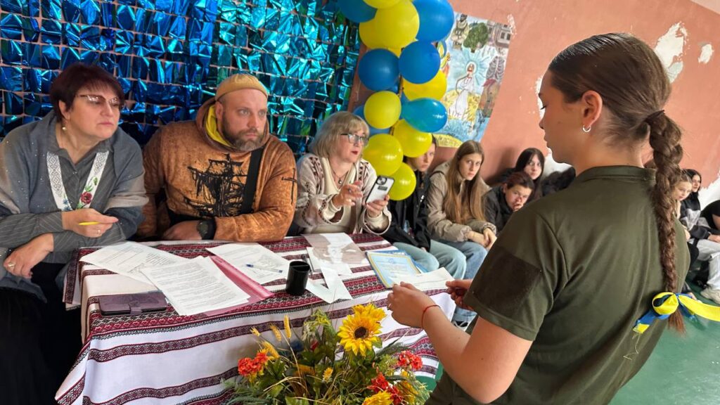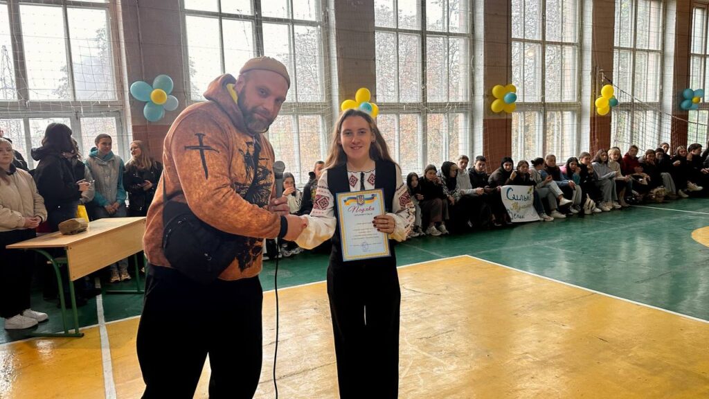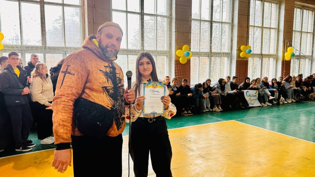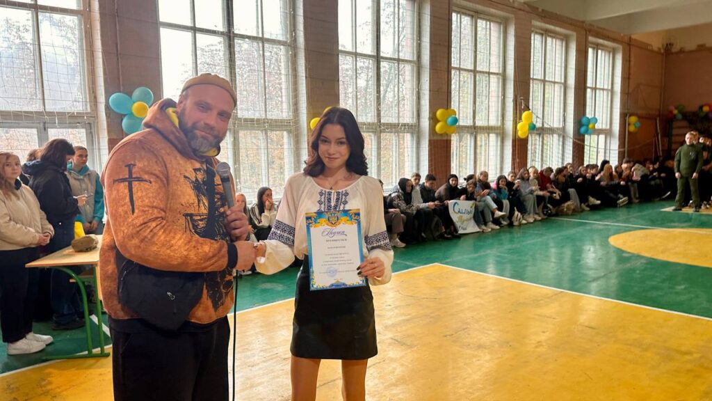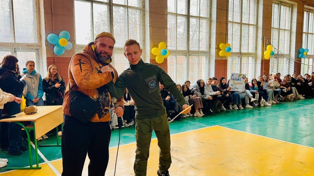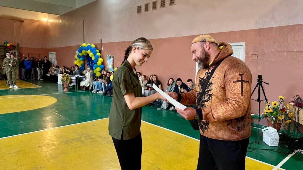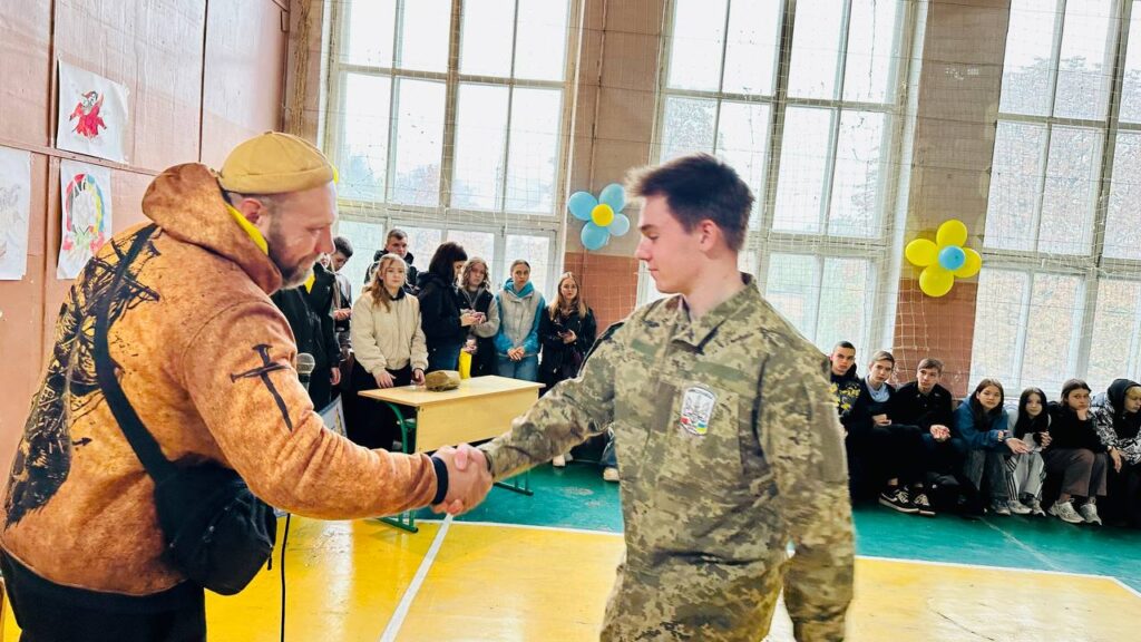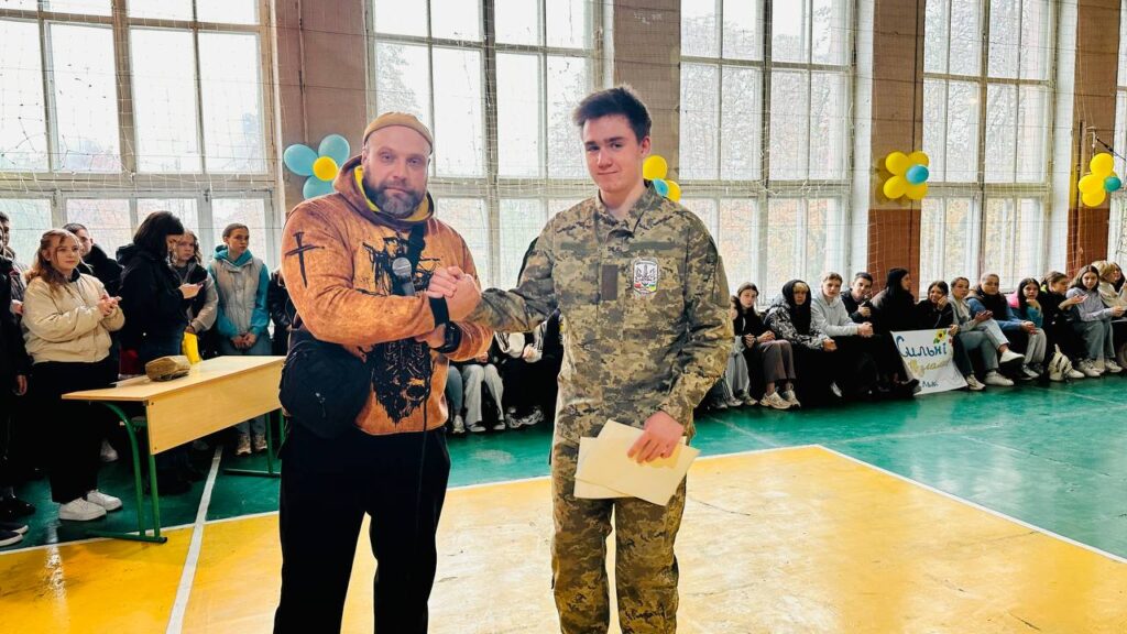 З вітальним словом до учасників звернувся Григорій Чуб, учасник бойових дій, викладач предметів «Захист України» та «Історія України».